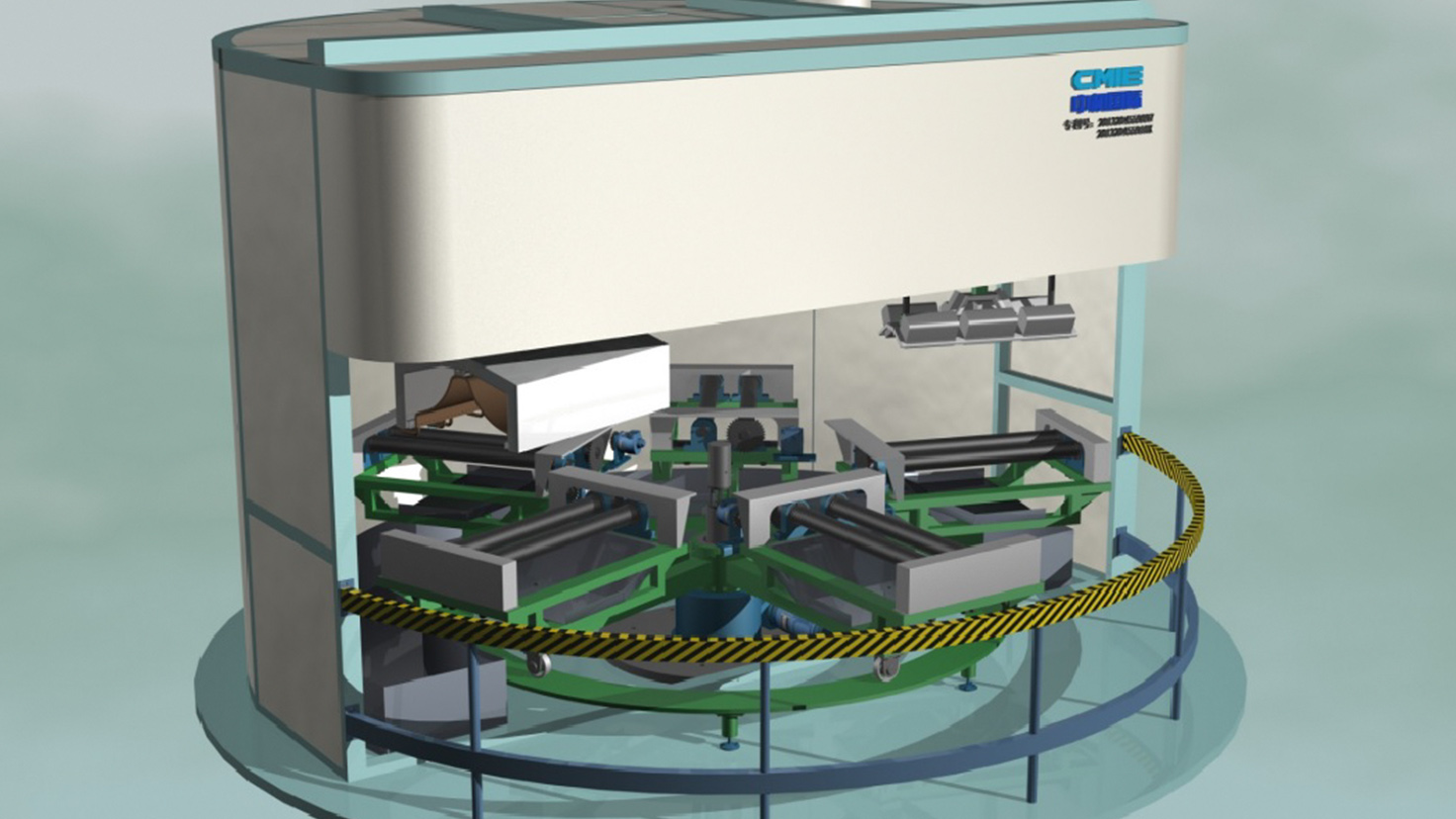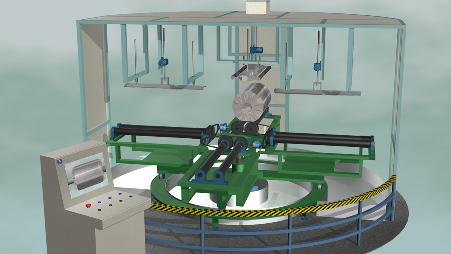 工程简介:依据电机转子加工后毛刺及粘连等特点,通过对电机转子表面进行加热、印酸去刺、碱中和及清洗以实现电机转子表面批量化去刺处理。根据工艺要求,转子酸洗机设置四个工位,分别为上下料、加热印酸、碱洗中和和水清洗和烘干工位,由机架、转盘机构、加热装置、印酸装置、印碱装置、洗刷装置、烘干装置、废液回收槽、去雾通风系统、储酸箱、储碱箱及控制系统组成。转子酸洗机设备尺寸:Φ4200×2400mm;加工转子范围:总长度范围:770mm~1670mm,最大外圆直径:210mm~445mm(H225-355),铁心部分长度≤700mm,重量<400kg。电机转子经转子酸洗机酸洗后装机,电机效率提升0.2%。